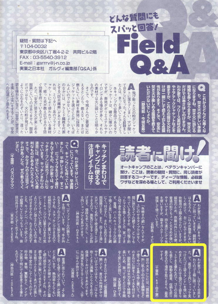 この月はいくつか投稿したので「読者に聞け!」コーナーの他にも掲載されました。10月に行った涸沼自然公園キャンプ場での様子を元に投稿しました。それまでずっと雨キャンプが続いていたのでそのことについてのエピソードなどについて書きました。