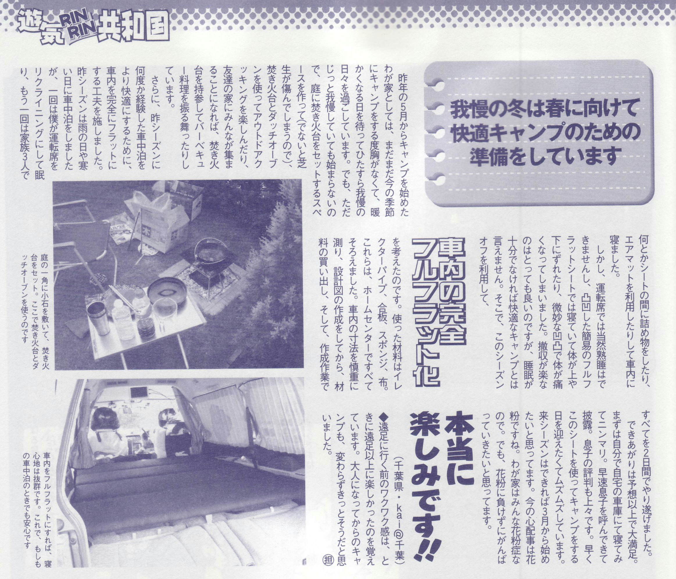 2005年の思い出に残った写真を投稿してくださいとの企画があったので、我が家で始めていったキャンプで撮った写真を投稿したところ掲載されました。場所は「成田ゆめ牧場オートキャンプ場」です。行ったのは5月の連休でしたね。